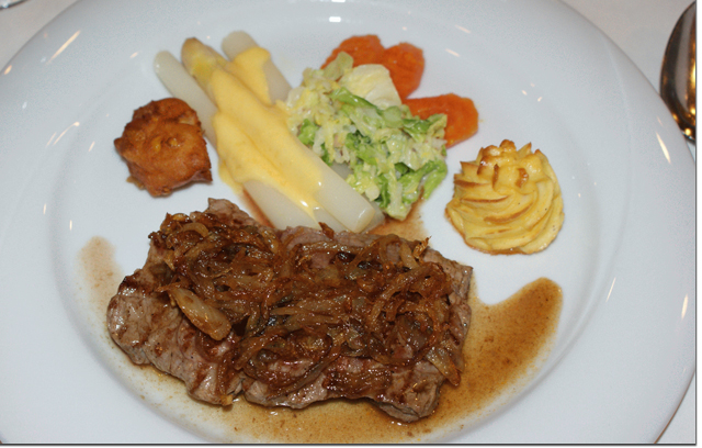 dazu Herzoginkartoffeln, hausgemachte Spätzle und zartes Marktgemüse