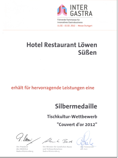 INTER GASTRA Führende Fachmesse für innovatives Gastrobusiness Silbermedaille INTER GASTRA Führende Fachmesse für innovatives Gastrobusiness Silbermedaille Tischkultur-Wettbewerb "Couvert d' or 2012"