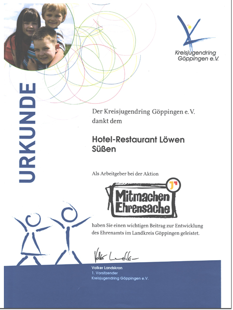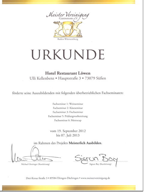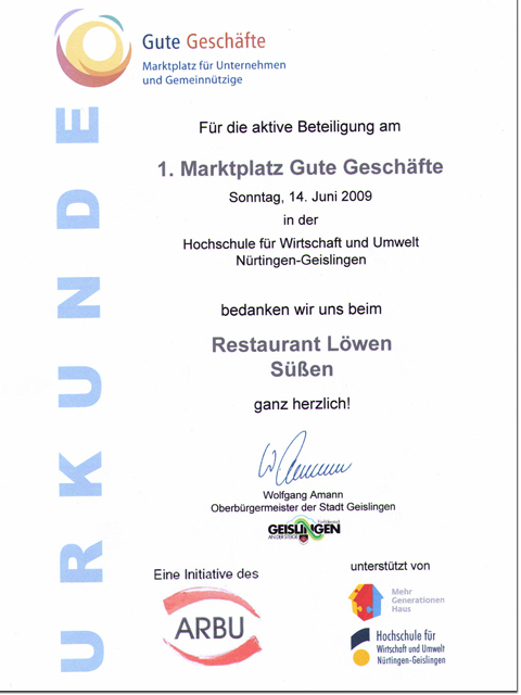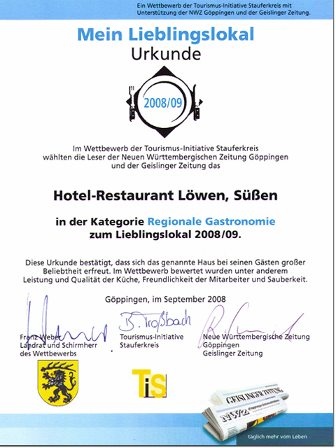 Mein Lieblingslokal Urkunde 2008/2009 Mein Lieblingslokal Urkunde 2008/2009 Hotel-Restaurant Löwen, Süßen in der Kategorie Regional Gastronomie zum Lieblingslokal 2008/2009