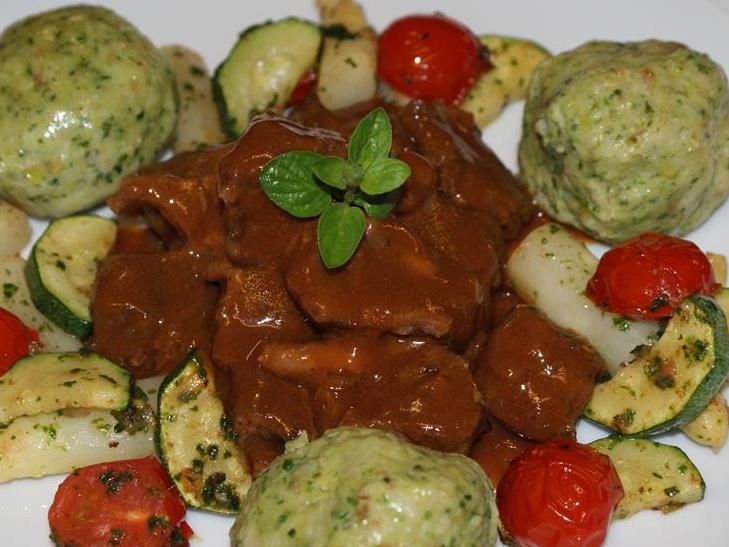 Geschnetzelte, saure Schweineleber mit frischen Champignons, Bratkartoffeln und gemischter Salat (auf Anfrage)